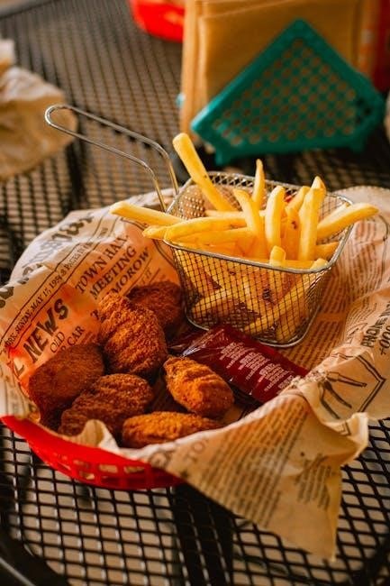 Before each use, ensure the pot is clean and free of debris. The basket’s design promotes even cooking and drainage. Avoid overcrowding the basket to maintain oil circulation and consistent crispness. Regularly inspect both components for wear and tear, replacing them as needed for optimal performance.